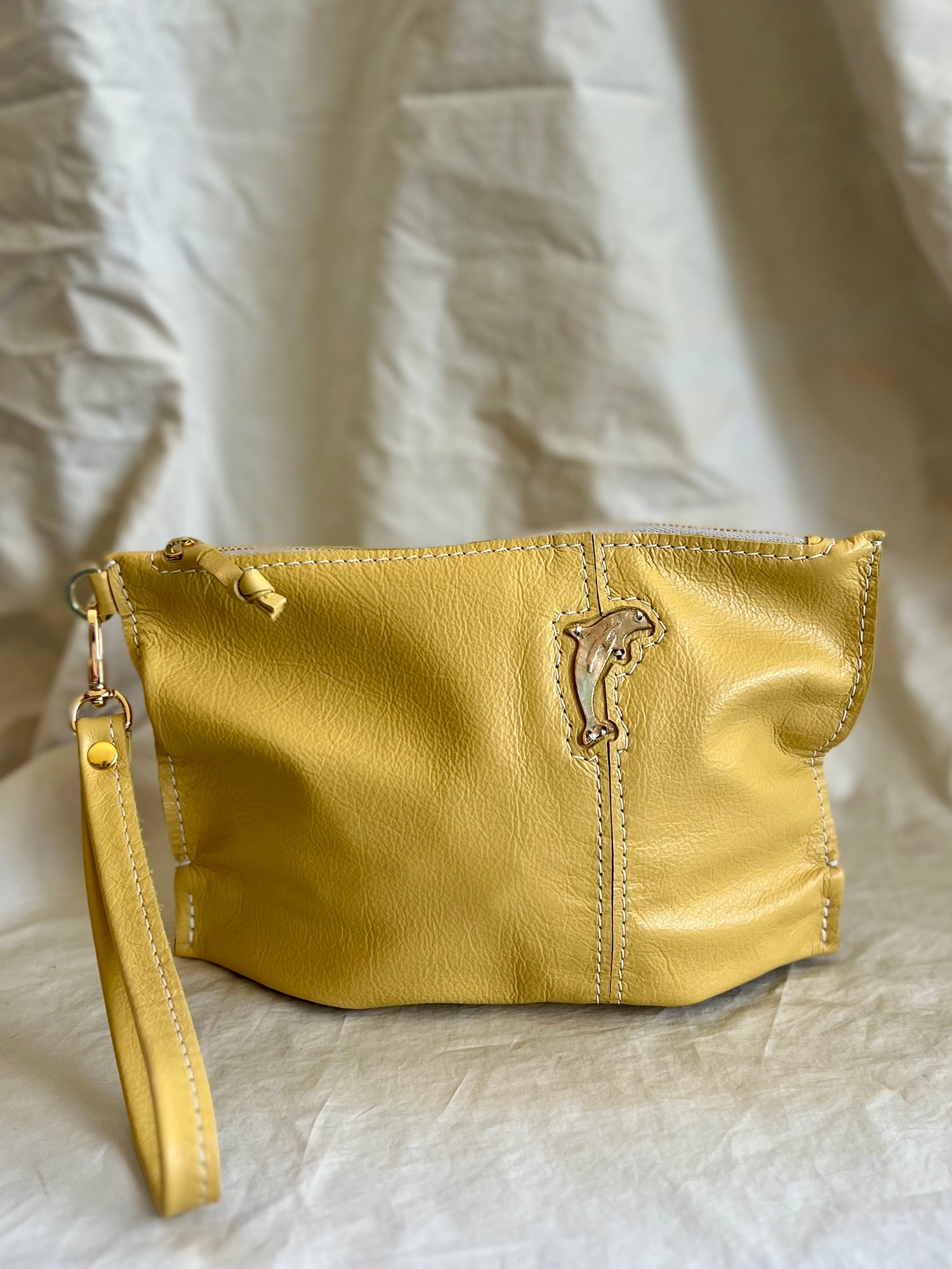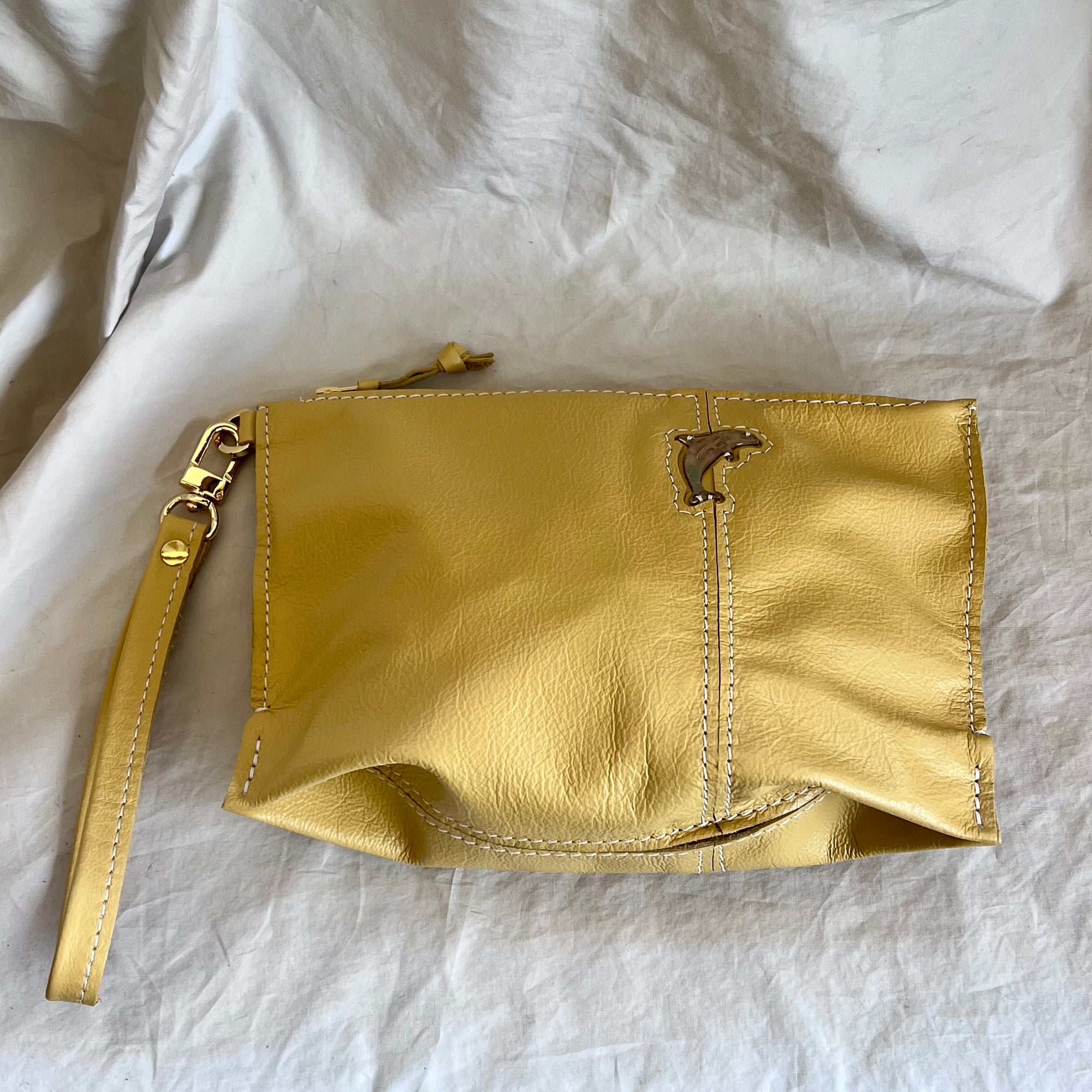 *Butter Italian leather, bronze Dolphin*9.25”w x 6.25”h x 2.5”d *6.5” wrist strapFinal sale, no returns or exchanges