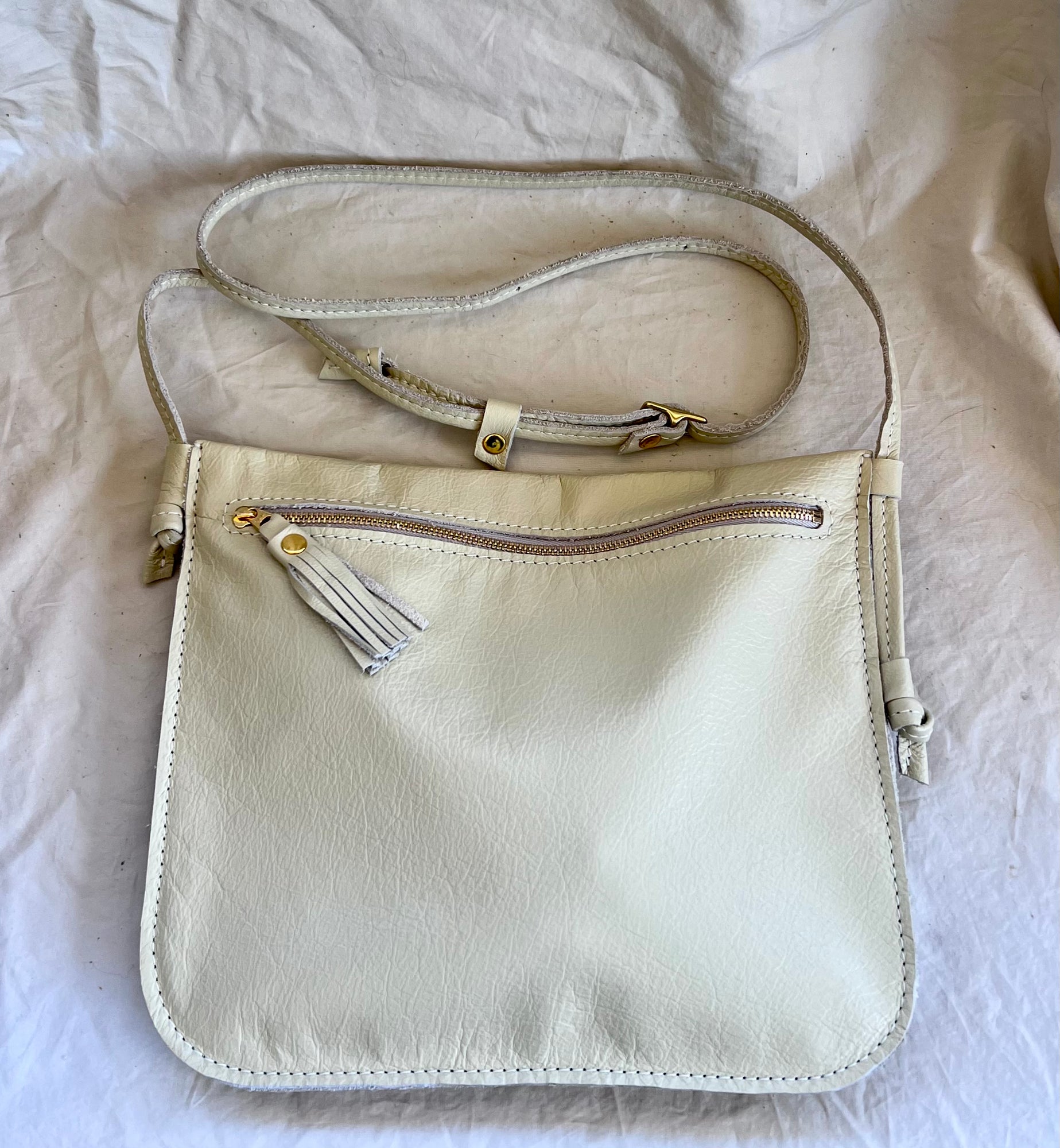 Crossbody strap with solid brass buckle adjuster