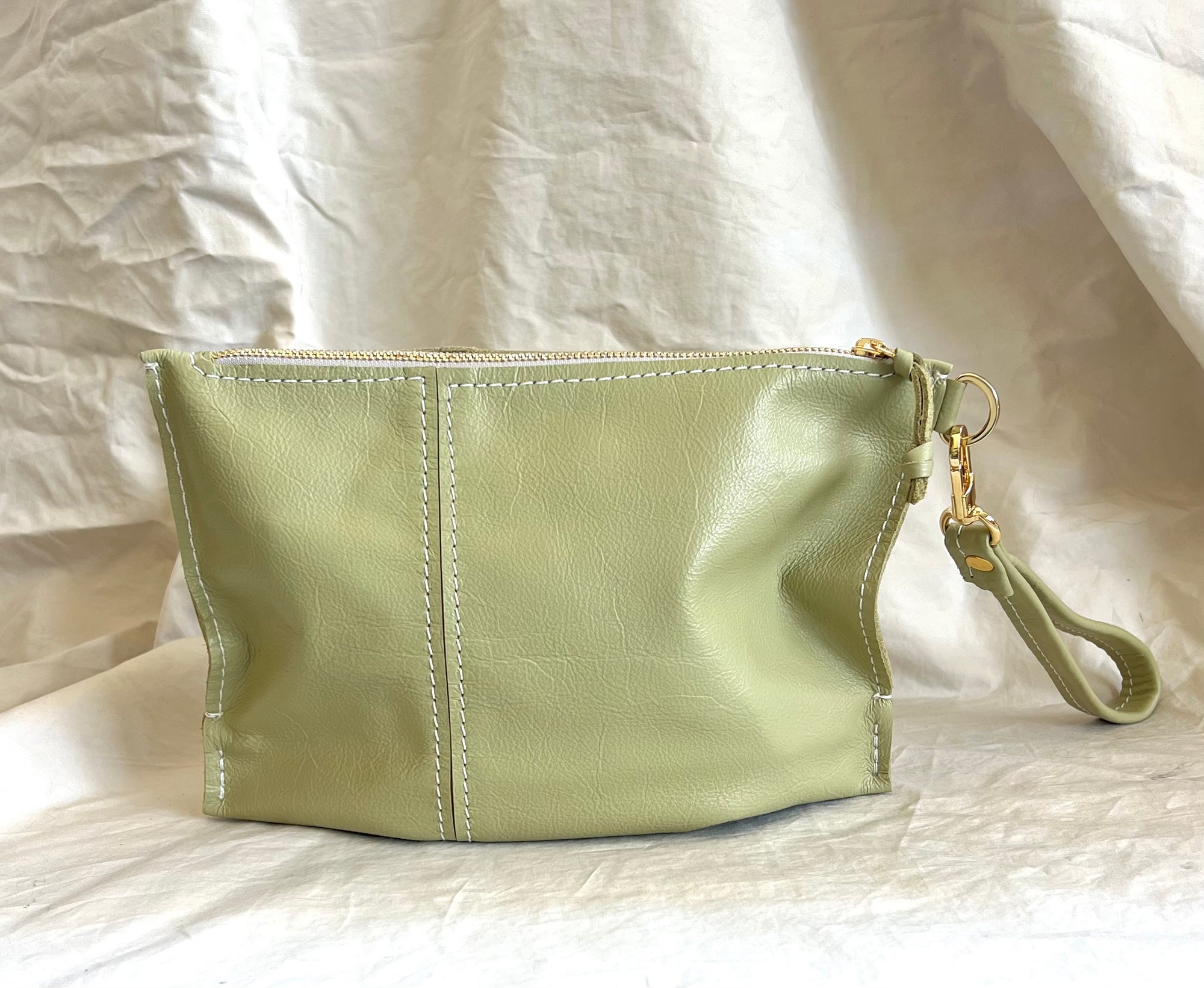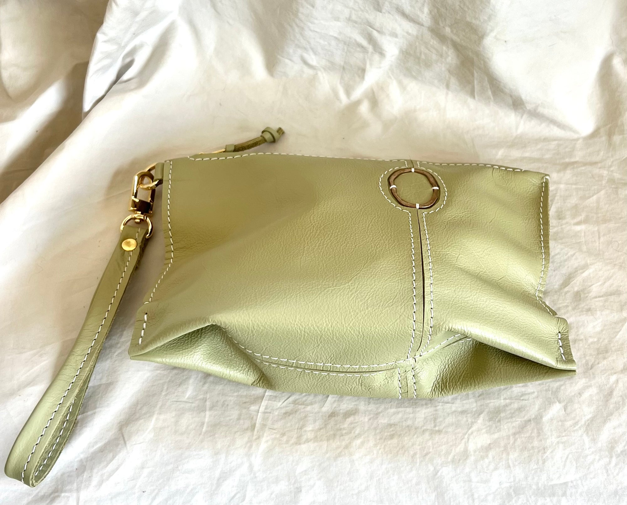 *Lichen Italian leather, bronze Oval*9.25”w x 6.25”h x 2.5”d *6.5” wrist strapFinal sale, no returns or exchanges